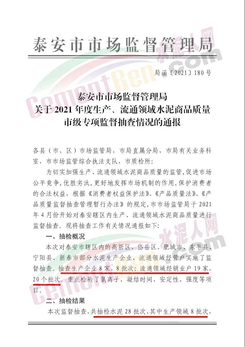 通报称,市市场监管局于 2021年 4 月份开始对泰安市辖区内的高新区、岱岳区、肥城市、东平县、宁阳县、新泰市部分水泥生产企业、流通领域经营户实施了监督抽查。重点检验了氯离子、凝结时间、安定性、强度等项目。