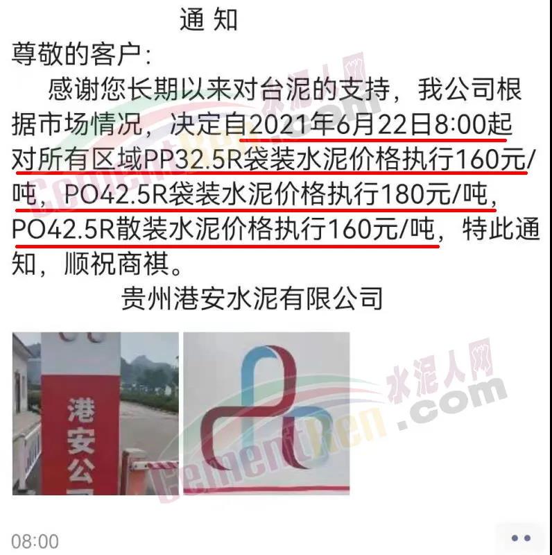 水泥人网通讯员消息:日前,贵州港安水泥有限公司公司通知称,根据市场情况,决定自2021年6月22日8∶00起对所有区域PP32.5R袋装水泥价格执行160元/吨,PO42.5R袋装水泥价格执行180元/吨, PO42.5R散装水泥价格执行160元/吨。且贵州区域三家台泥工厂统一执行此价,较此前报价下跌100-150元/吨。