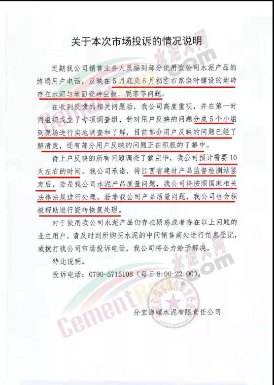 公司承诺:待江西省建材产品监督检测站鉴定后,若是分宜海螺水泥产品质量问题,企业将按照国家相关法律法规进行处理;若非企业产品质量问题,分宜海螺也会积极帮助进行瓷砖恢复处理。