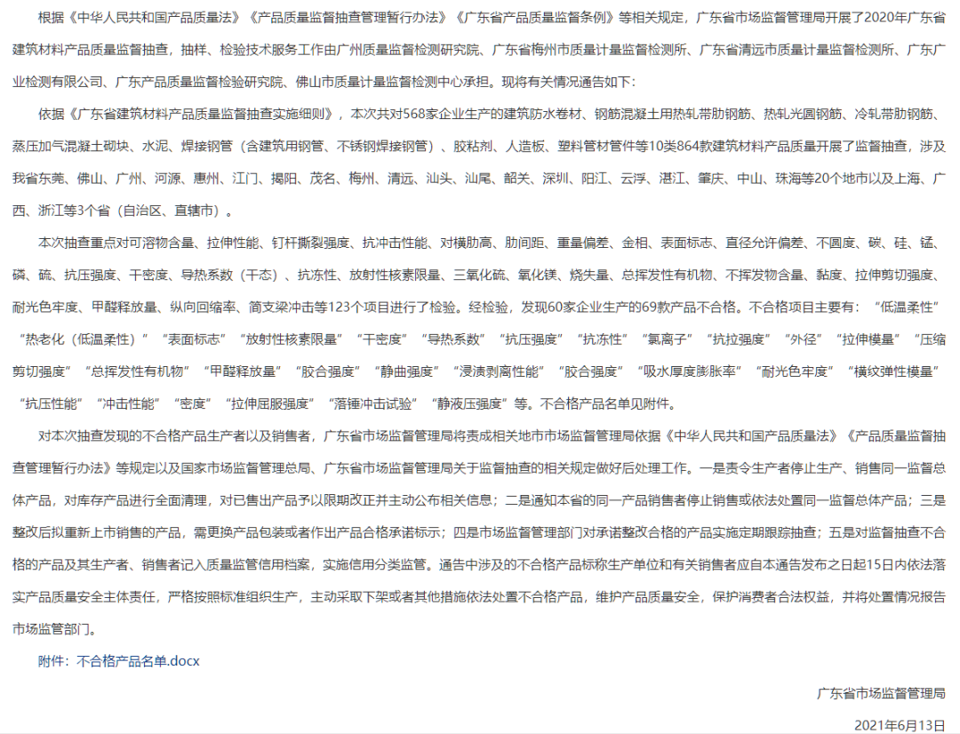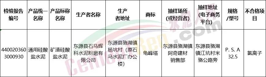 经检验,发现60家企业生产的69款产品不合格。其中水泥产品发现一个批次矿渣硅酸盐水泥P.S.A32.5不合格。生产者名称为东源县石马辉科水泥粉磨有限公司,商标为“龟峰塔”。不合格项目为氯离子。