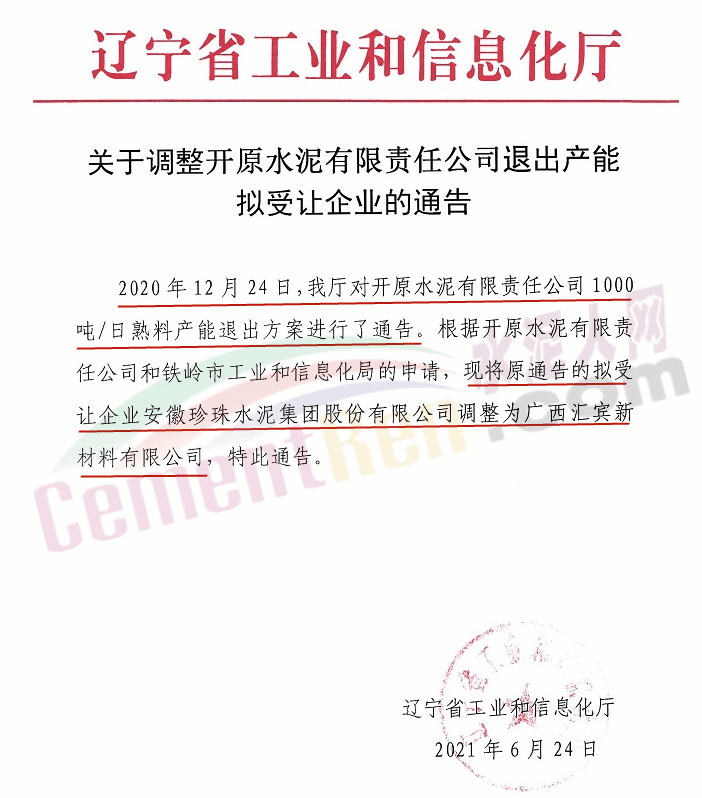 日前,辽宁省工业和信息化厅发布《关于调整开原水泥有限责任公司退出产能拟受让企业的通告》将开原水泥有限责任公司1000t/d熟料产能的原拟受让企业安徽珍珠水泥集团股份有限公司调整为广西汇宾新材料有限公司。具体通告如下: