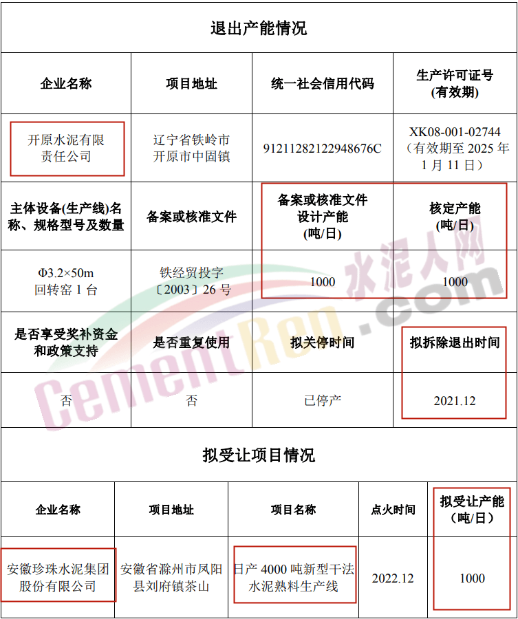熟料生产线产能退出方案的通告》称,按照相关文件要求,将开原水泥有限责任公司1000t/d水泥熟料产能置换至安徽安徽珍珠水泥集团股份有限公司用于新建一条4000t/d