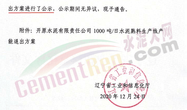 水泥人网了解,2020年12月24日,辽宁省工业和信息化厅发布《关于开原水泥有限责任公司1000吨/日水泥