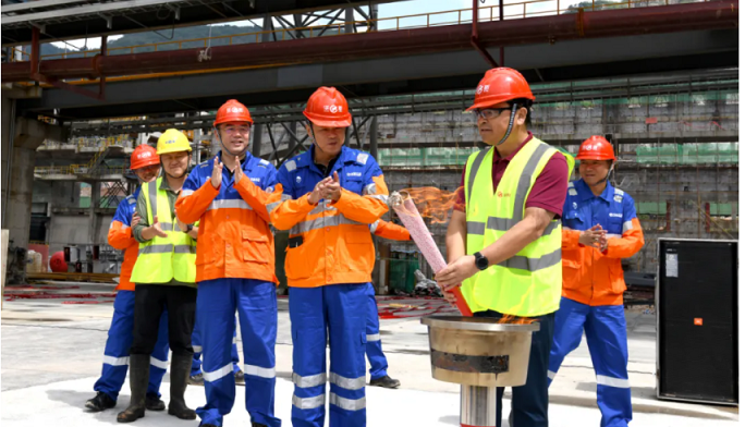 华新公司党委书记、总裁李叶青为华新设计制造的全套国产化设备万吨线投产点火