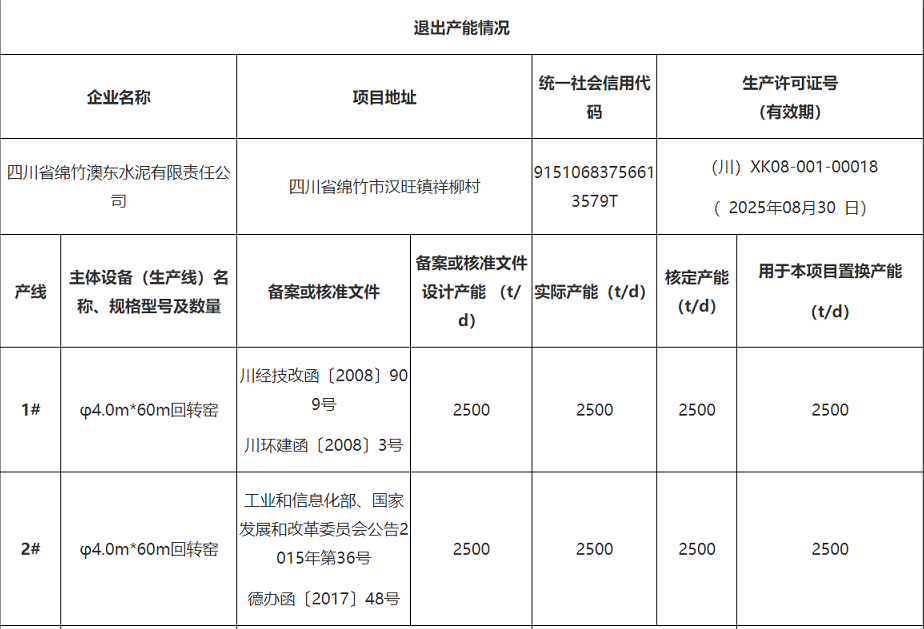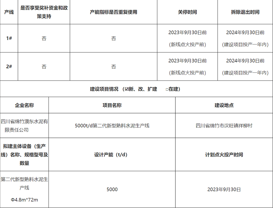 按照《国务院关于化解产能严重过剩矛盾的指导意见》(国发〔2013〕41号)、《国务院办公厅关于促进建材工业稳增长调结构增效益的指导意见》(国办发〔2016〕34号)、《工业和信息化部关于印发钢铁水泥玻璃行业产能置换实施办法的通知》(工信部产业〔2017〕337号)有关规定,根据《关于绵竹澳东水泥有限责任公司智能化升级改造的复函》(工原函〔2021〕317号)文件要求。2021年6月17日至2021年6月23日,四川省经济和信息化厅对“四川省澳东水泥5000t/d水泥熟料生产线智能化升级改造项目”进行了网上公示,公示期间未收到异议,现在予以正式公告,欢迎社会公众进行监督。