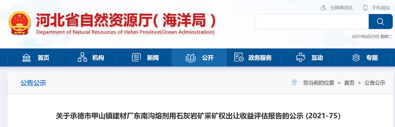 2021年6月28日,河北自然资源厅公示了承德市甲山镇建材厂东南沟熔剂用石灰岩矿采矿权出让收益评估报告,如下:
