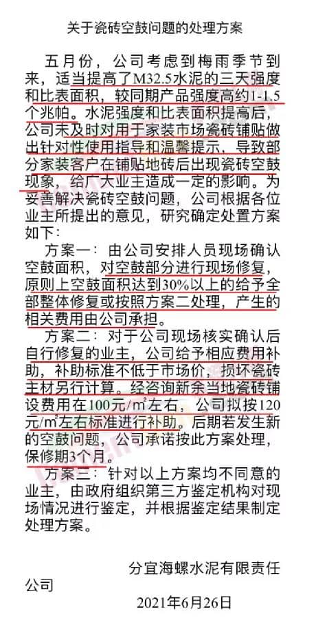 水泥强度和比表面积提高后,公司未及时对用于家装市场瓷砖铺贴做出针对性使用指导和温馨提示,导致部分家装客户在铺贴地砖后出现瓷砖空鼓现象,给广大业主造成一定的影响。为妥善解决瓷砖空鼓问题,公司根据各位业主所提出的意见,研究确定处置方案如下∶