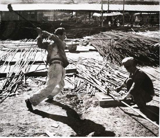 照片中的主人公傅德成是热火朝天地参与永登水泥厂建设的一员,从白山黑水的东北来到莽莽苍苍的西北,他全神贯注地盯着目标,踮起脚尖,腰身前弓,张开双臂,抡起20多磅重的大锤,铆足全身的力气,准备轧断25#圆钢。不远处,已经有一堆轧好的圆钢静静等待着被搬去施工……