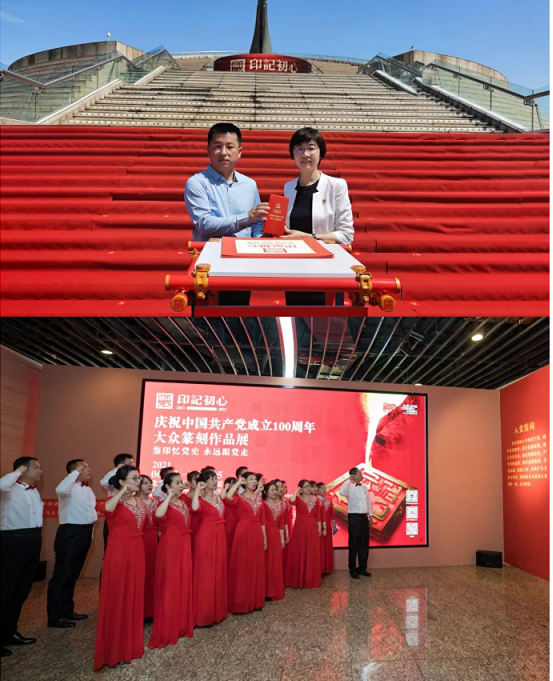 健跑前夕,孙力实向中华世纪坛赠送了新材料印章,广大党员参观中华世纪坛举办的“印记初心——庆祝中国共产党成立100周年大众篆刻作品展”,并开展重温入党誓词活动。