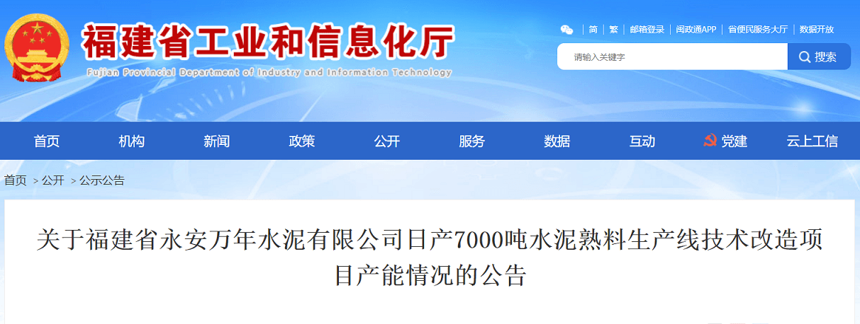 福建省永安万年水泥有限公司拟拆除整合公司现有的1条日产2500吨和1条日产4500吨水泥熟料生产线,在原厂区技术改造建设1条日产7000吨水泥熟料生产线。根据《国务院关于化解产能严重过剩矛盾的指导意见》(国发〔2013〕41号)和《工业和信息化部关于印发钢铁水泥玻璃行业产能置换实施办法的通知》(工信部原〔2017〕337号)等有关要求,现将福建省永安万年水泥有限公司日产7000吨水泥熟料生产线技术改造项目产能情况予以公告,欢迎社会公众进行监督。联系电话:0591-83613733。