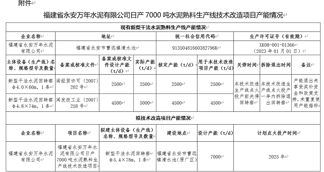 附件:福建省永安万年水泥有限公司日产7000吨水泥熟料生产线技术改造项目产能情况
