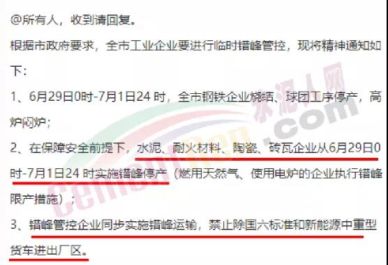 在保障安全前提下,水泥、耐火材料、陶瓷、砖瓦企业从6月29日0时-7月1日24时实施错峰停产;错峰管控企业同步实施错峰运输,禁止除国六标准和新能源中重型货车进出厂区。