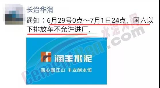 长治华润水泥通知,6月29日0时至7月1日24时,国六以下排放车不允许进厂。