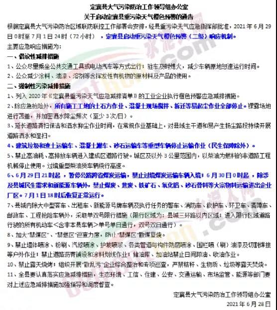 山西省忻州市定襄县通知2021年6月29日0时至7月1日24时(72小时),山西省忻州市定襄县启动重污染天气橙色预警(二级)响应机制。要求所有施工工地的土石方作业、混凝土现场搅拌、拆迁等易起尘作业全部停止。建筑垃圾和渣土运输车、混凝土罐车、砂石运输车等重型车辆停止运输作业。