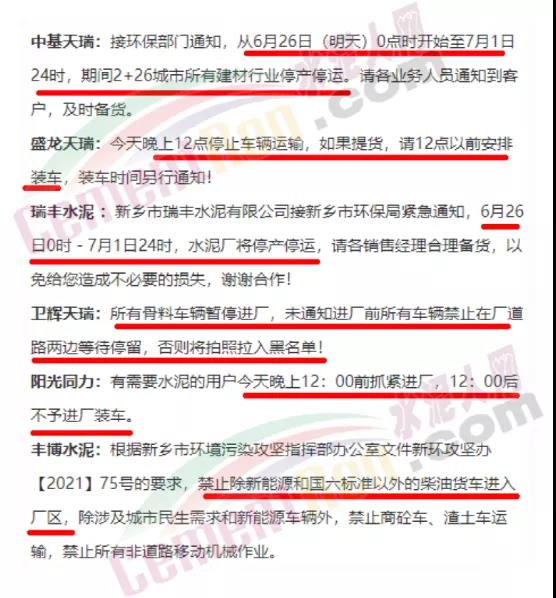 要求自2021年6月26日0时至7月1日24时新乡市全域范围内包括水泥及水泥制品在内的所有建材企业停产;生产调控企业同步错峰运输,禁止除新能源和国六标准以外的中重型货车进出厂区,禁止商砼车、渣土车运输,禁止非道路移动机械作业;矿山、砂石料厂、石板材厂等停止露天作业。应通知要求河南新乡多家企业通知暂停装车。