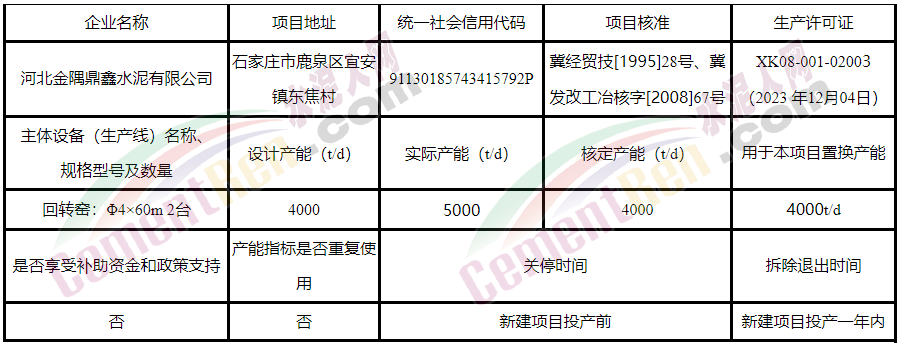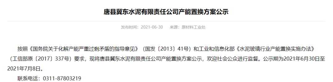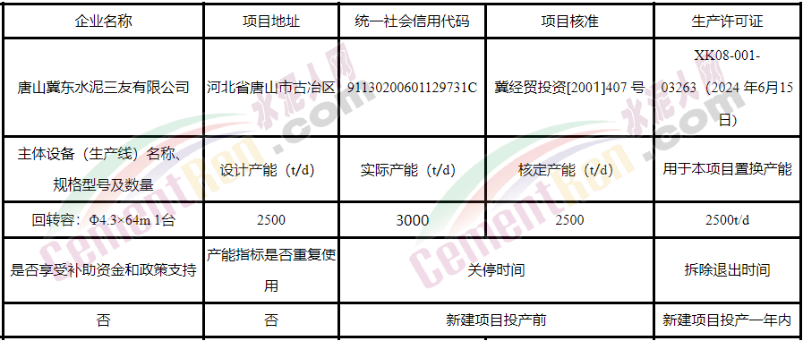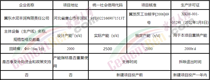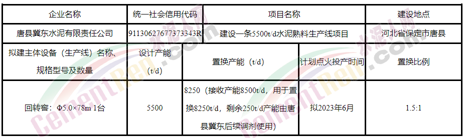 日前河北工信厅发布《唐县冀东水泥有限责任公司产能置换方案公示》将退出冀东水泥丰润有限责任公司一条2000t/d生产线、唐山冀东水泥三友有限公司一条2500t/d生产线、河北金隅鼎鑫水泥有限公司一条4000t/d生产线,合计约255万吨产能,用于唐县冀东水泥有限责任公司新建一条5500t/d水泥熟料生产线,置换比例1.5:1。回转窑规格Φ5.0×78m拟2023年6月点火投产。 产能置换方案 退出项目情况 项目一 项目二 项目三 建设项目情况