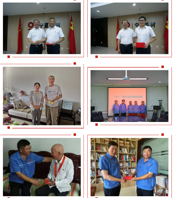 近日,宁夏建材各级党组织通过组织座谈会、下基层、进家门、送关怀等形式对30名获得县级以上优秀党员、优秀党务工作者,12名困难党员和3名离退休老干部进行了慰问,并向他们转达了党组织对他们的关怀,褒扬他们为公司的经营发展作出的贡献,了解他们的思想动态和具体诉求,积极帮助他们解决实际困难。