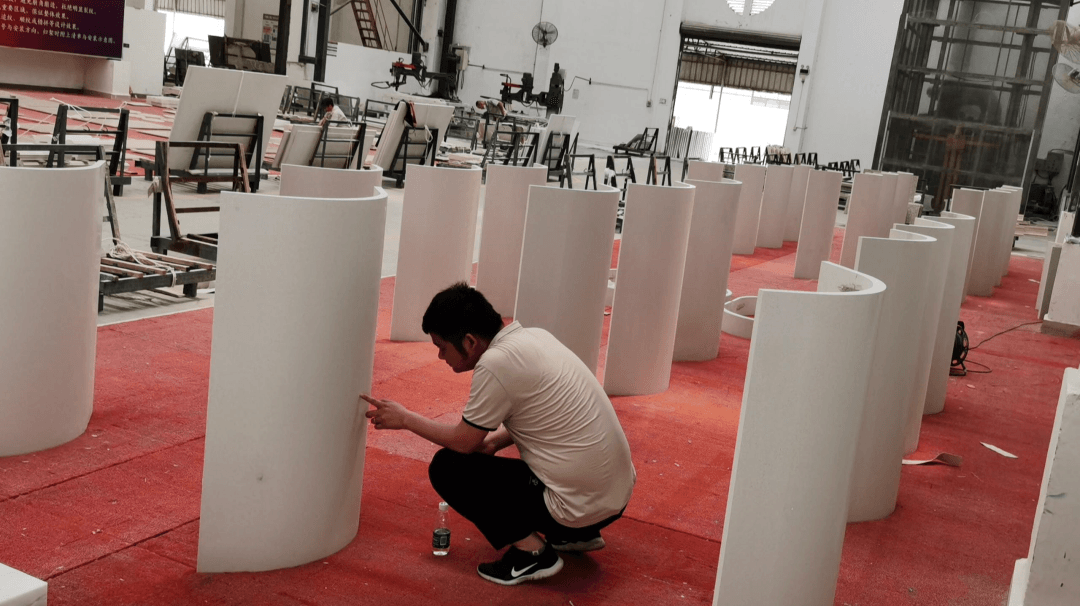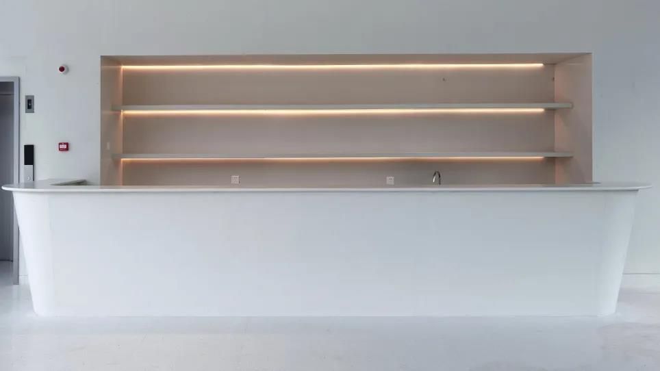 华润水泥人造石具有良好的加工性,数十条近四米高的圆角方柱,由华润水泥人造石“嘉兴白”整体包裹,与铝板天花、地面连成一片白色,将整个空间衬托的明亮整洁。
