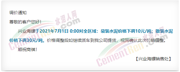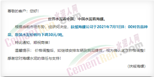 日前广西扶绥海螺、兴业海螺分别通知自即日起下调水泥价格10-30元/吨。