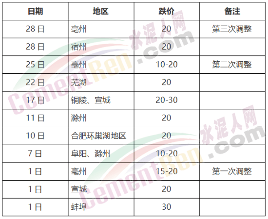 安徽省主要水泥市场需求不济,水泥企业库存压力增加,水泥价格随之出现下跌。亳州三次累计下跌45-60元/吨,目前主流品牌P.O42.5散装水泥市场到位价在365-375元/吨。