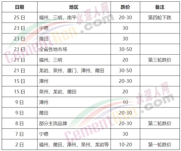 21日福建地区部分品牌水泥针对全省各地市场报价下跌30-50元/吨,开启第四轮价格下跌,市场行情不佳,后期价格或以跌势为主。