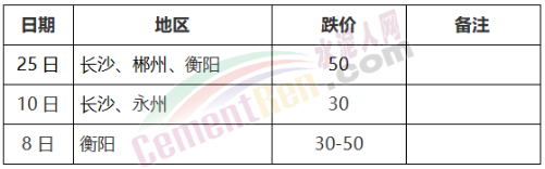 6月份长沙、郴州、衡阳、永州等多地水泥价格下调30-50元/吨。其中长沙地区部分品牌水泥价格下跌50元/吨,市场累计下跌80-90元/吨。现主流品牌PO42.5散装市场成交价400-430元/吨。