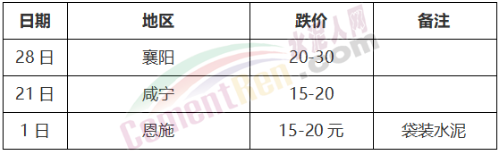 本月内湖北襄阳、咸宁、恩施等多地水泥价格小幅下调15-30元/吨。