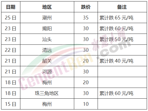 广东省自6月20日开始,潮州、揭阳、汕头、韶关等多地水泥价格持续下跌,两周内累计下跌达40-65元/吨。跌价后各区域水泥价格跌破500元/吨,保持在400-470元/吨。