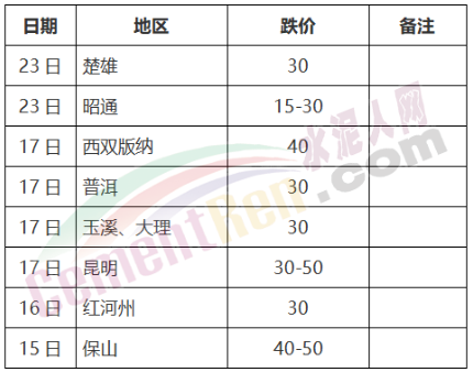 6月内,云南昆明、楚雄、昭通、西双版纳、普洱、玉溪、大理、红河、保山等区域水泥价格回落,其中昆明由于市场需求疲软,加之新增产能释放冲击市场,6月中旬前后,部分主流品牌水泥价格下跌30-50元/吨。