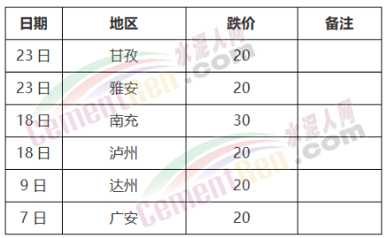 四川省甘孜州、雅安、南充、泸州、达州、广安在6月内多区域水泥价格下调20-30元/吨。