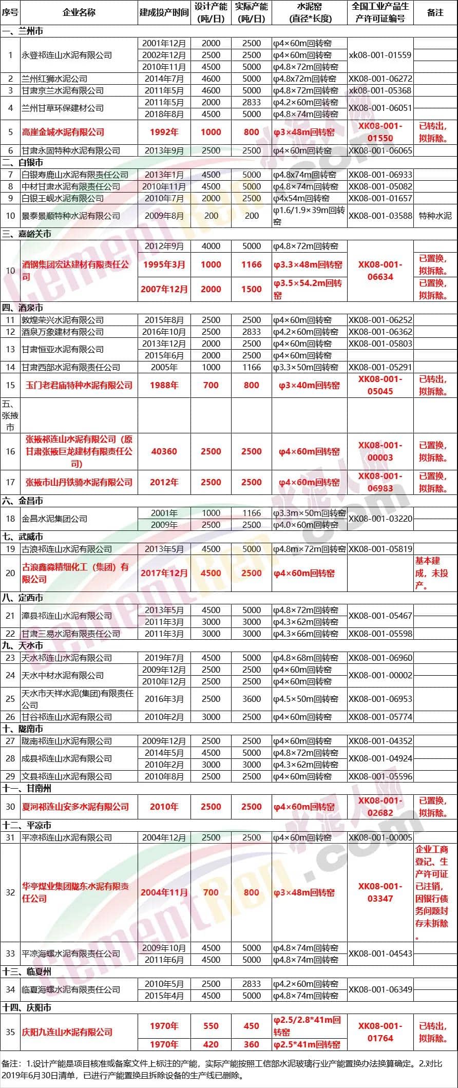 甘肃省水泥熟料生产线现状清单