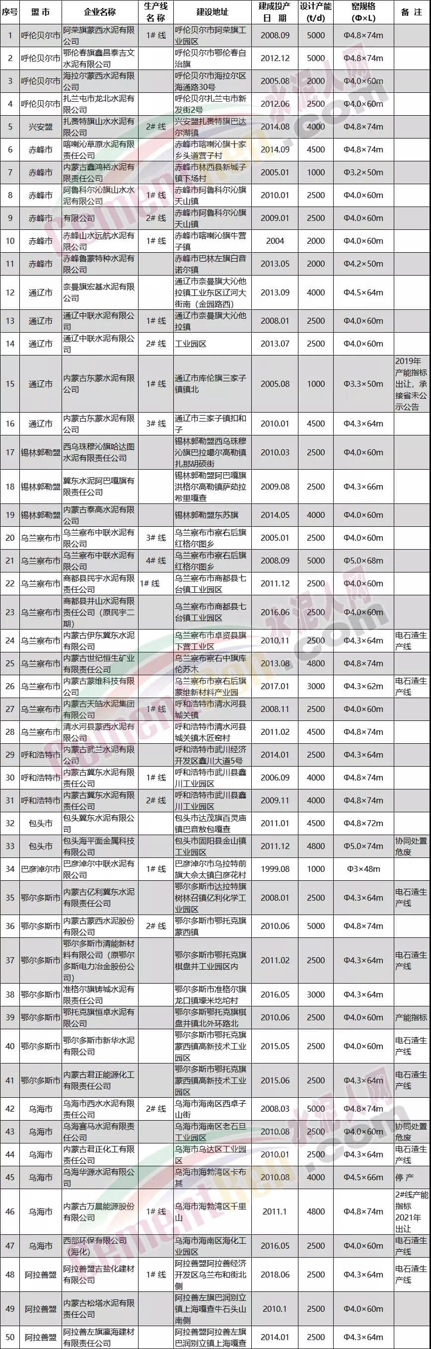 内蒙古自治区水泥熟料生产线清单