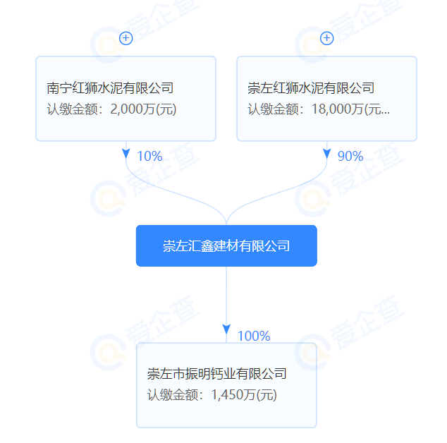 据了解,崇左汇鑫建材为红狮控股集团旗下企业,其中崇左红狮水泥拥有其90%股份,南京红狮水泥拥有其10%股份。