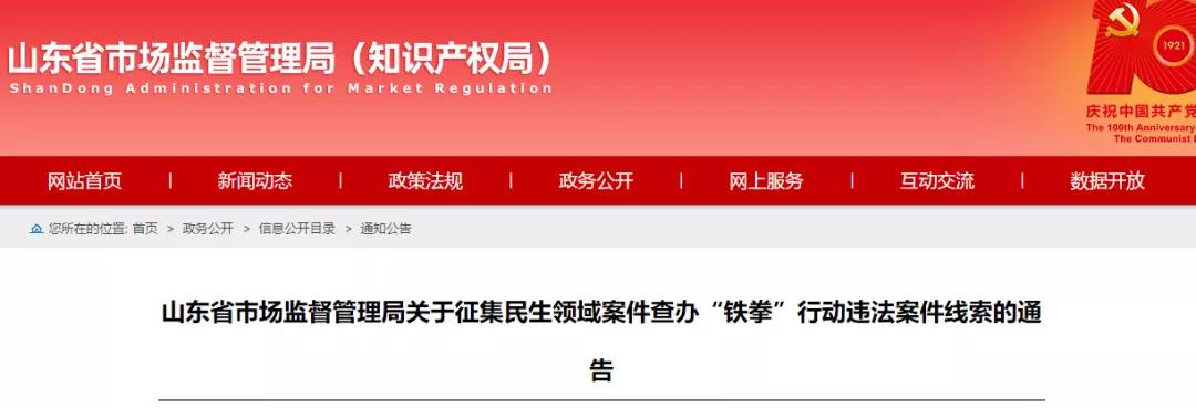 根据国家市场监管总局统一部署,山东省市场监督管理局在全省开展民生领域案件查办“铁拳”行动,“铁拳”行动坚持问题导向、目标导向,聚焦关系人民群众生命健康安全的重点商品、重点行业、重点区域,重点打击10类民生领域违法行为。现面向社会发布通告,公开征集下列10类违法案件线索: