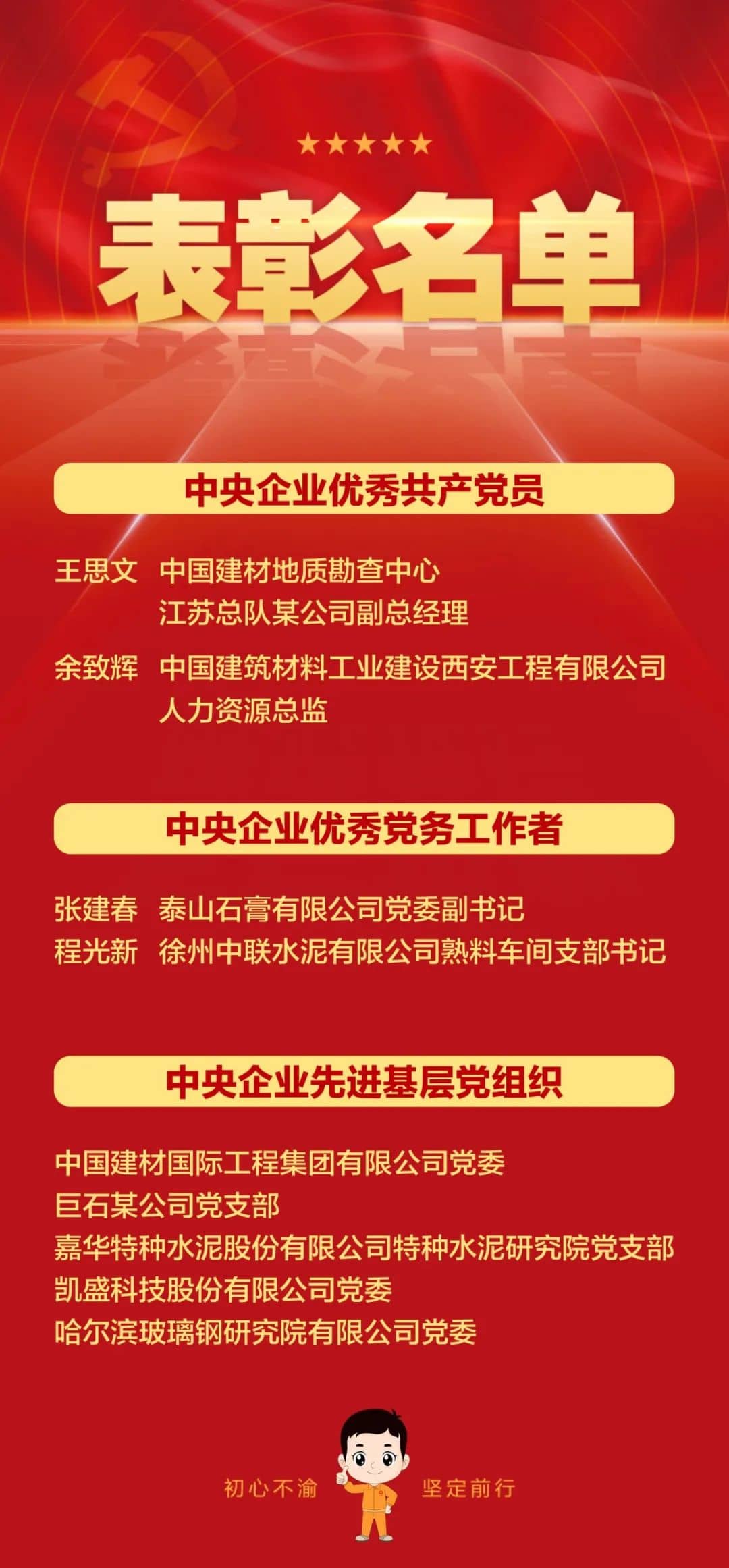 当前,中国建材集团正在深入开展党史学习教育,奋力开启“十四五”新征程。这次获得表彰的优秀个人和先进集体是中国建材集团的杰出代表,他们的先进事迹和崇高精神充分展示了新时代共产党人的先进性和纯洁性,生动诠释了共产党员的初心和使命。
