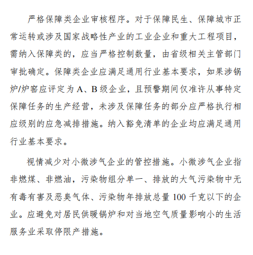 各地要认真对保障民生、保障城市正常运转或涉及国家战略性产业企业申报资料进行审核和现场核查,确需纳入保障类的,应当严格控制数量。原则上,对于保障类企业,须达到国家或河南省重点行业绩效分级B级及以上要求;对达不到B级及以上要求企业要实施重点帮扶,组织专业技术人员对其进行全面会诊、把脉,督促其加快治理进度,尽快达到B级水平。在重污染天气管控期间,保障类企业仅准许从事特定保障任务的生产经营,应严格按照重污染天气应急减排清单规定落实管控措施,如保障类企业超出允许生产经营范围、保障类工程未做到绿色施工相关要求的,一经发现,应立即移出保障清单。
