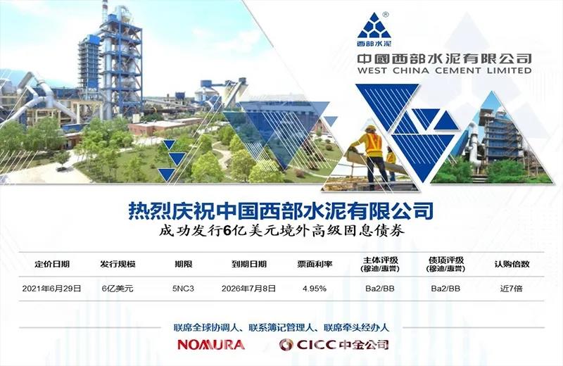 2021年6月29日,经过2个月的紧张筹备,中国西部水泥有限公司成功确认定价,发行了6亿美元境外高级固息债券,期限5年,利率4.95%。