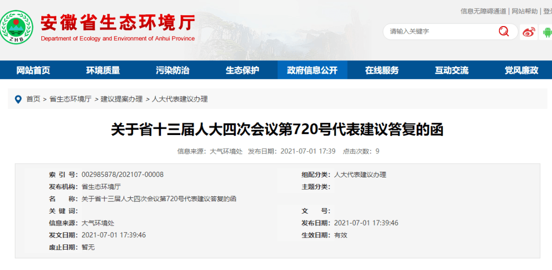 日前,安徽省生态环境厅官网发布《关于省十三届人大四次会议第720号代表建议答复的函》称,韩先云代表在省十三届人大四次会议期间提出的《关于进一步加强大气污染防治的建议》收悉,经研究办理,并给予答复。