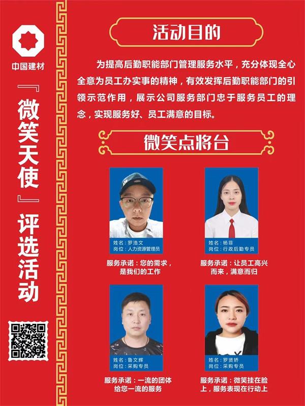 本次评选以爱岗敬业、文明服务、微笑办公等三个维度考核标准,将磅房、行政后勤、人力资源、财务、食堂服务等相关岗位人员纳入评选范围。动员全体一线员工扫码投票,结合后勤职能员工当月工作情况综合评比,奖惩分明,当月票数最高的员工被评为当月“微笑天使”,给予奖励;同时对票数最低的员工给予一定的考核,均在当月工资中体现。
