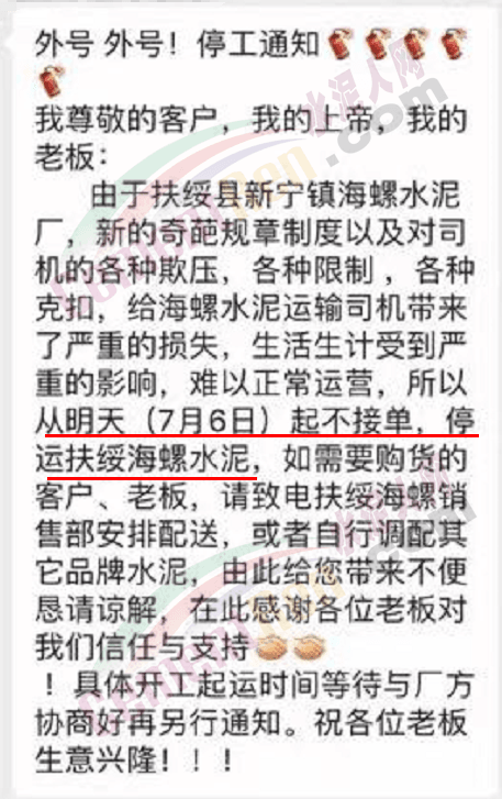 日前,有物流司机在群里发通知消息称:“由于扶绥县新宁镇海螺水泥厂,新的奇葩规章制度以及对司机的各种欺压,各种限制,各种克扣,给海螺水泥运输司机带来了严重的损失,生活生计受到严重的影响,难以正常运营,所以从7月6日起不接单,停运扶绥海螺水泥。”
