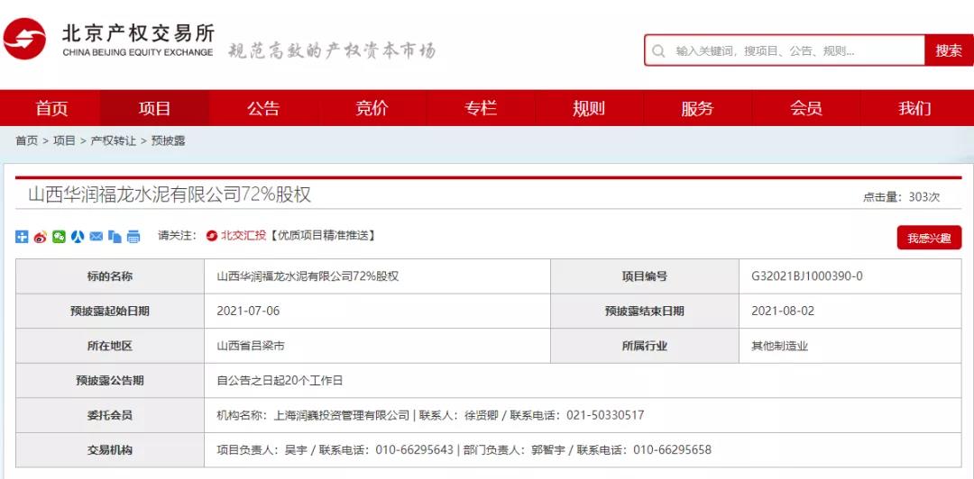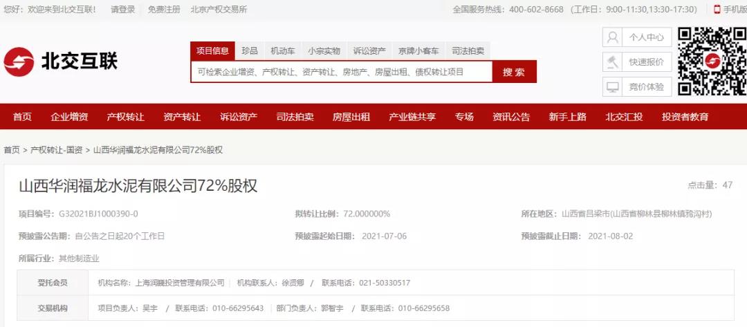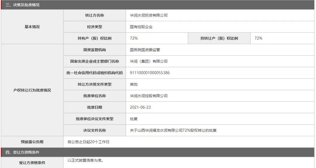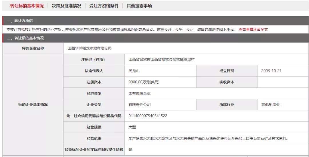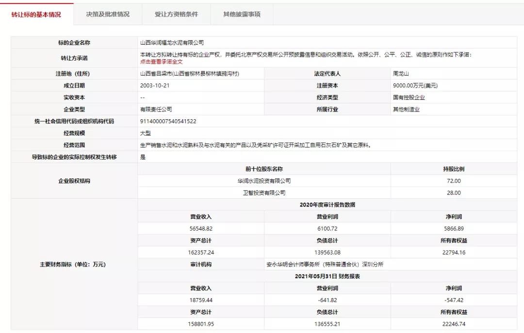 日前,北京产权交易所发布山西华润福龙水泥有限公司72%股权转让消息,山西华润福龙水泥有限公司注册地(住所)山西省吕梁市山西省柳林县柳林镇鸦沟村。注册资本9000.00万元(美元),经济类型国有控股企业。