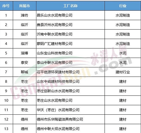 7月5日,山东省工业和信息化厅发布《省级绿色工厂(第一批)名单公示》。公示名单85家省级绿色工厂中,包括昌乐山水水泥有限公司、费县沂州水泥有限公司、沂南中联水泥有限公司、蒙阴广汇建材有限公司、山东宝山科技有限公司、泰山中联水泥有限公司、茌平信源环保建材有限公司、山东中岩建材科技有限公司、枣庄创新山水水泥有限公司、枣庄山水水泥有限公司、华沃(枣庄)水泥有限公司、德州中联大坝水泥有限公司等13家水泥建材企业。
