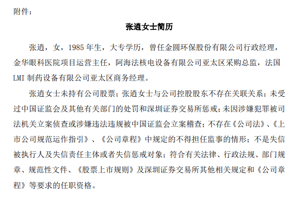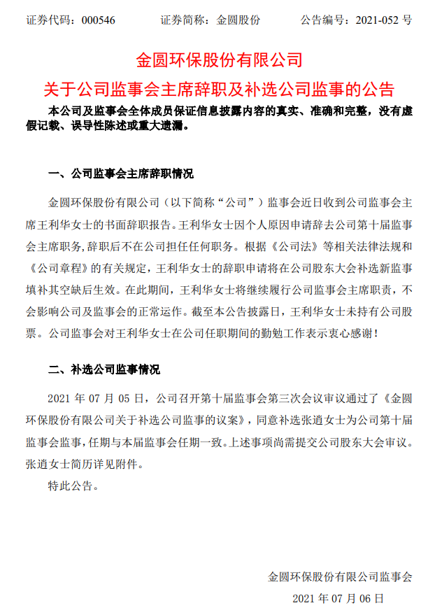 日前,金圆环保股份有限公司发布公告称,金圆环保股份有限公司监事会近日收到公司监事会主席王利华女士的书面辞职报告。王利华女士因个人原因申请辞去公司第十届监事会主席职务,辞职后不在公司担任任何职务。