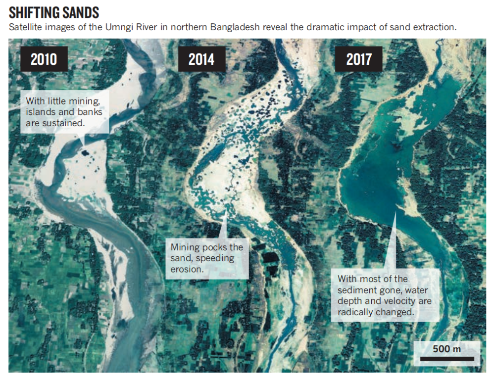 孟加拉国北部乌姆吉河的卫星图像显示了采砂的巨大影响