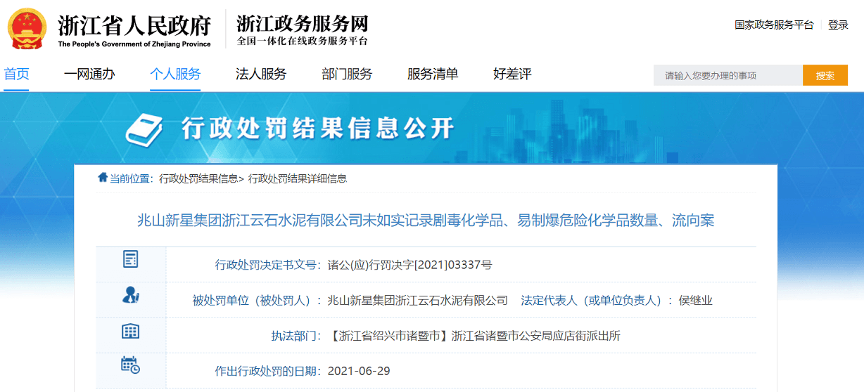 日前,浙江省人民政府政务服务网,通报了兆山新星集团浙江云石水泥有限公司未如实记录剧毒化学品、易制爆危险化学品数量、流向案。
