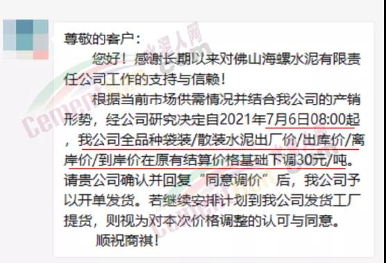 水泥人网信息中心消息,日前广东省佛山海螺水泥通知:自2021年7月6日8时起,全品种袋装/散装水泥出厂价/出库价/离岸价/到岸价在原有结算价格基础下调30元/吨。