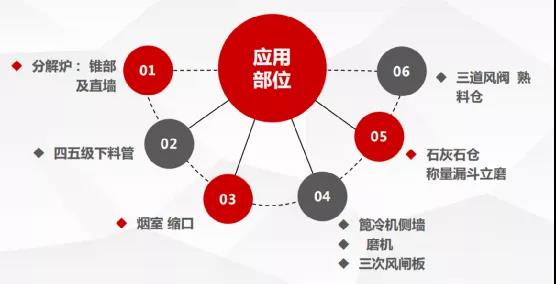 为解决水泥行业长期以来的困扰,水泥人网经过长期的市场调研,发现微晶产品的应用在缓解水泥预分解系统结皮的问题上作用明显。山东淄博乾沃工贸有限公司(以下简称“乾沃工贸”)是一家国内最早研制微晶耐磨防结皮材料的企业,专注于微晶新材研发多年,其生产的水泥窑专用微晶耐磨防结皮新材可应用于水泥行业的烟室、篦冷机、预热器、下料管、磨机内衬、脱硝器内衬、筒仓内衬等多个部位。具体如图1