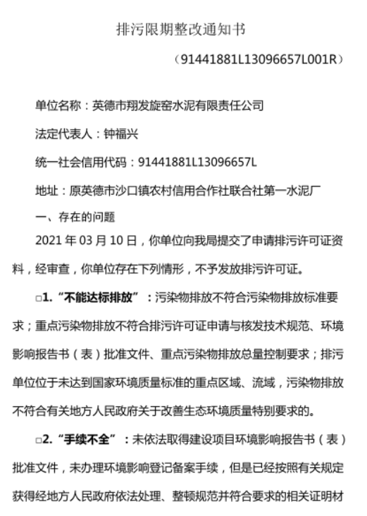 其中,今年3月30日下达限期整改的广东清远英德市翔发旋窑水泥有限责任公司整改问题为“未按规定对废气进行收集处理、未进行无组织排放控制要求、其他-未按规定设置污染物排放口、未完成自主验收手续”等。企业整改措施、整改计划如下:
