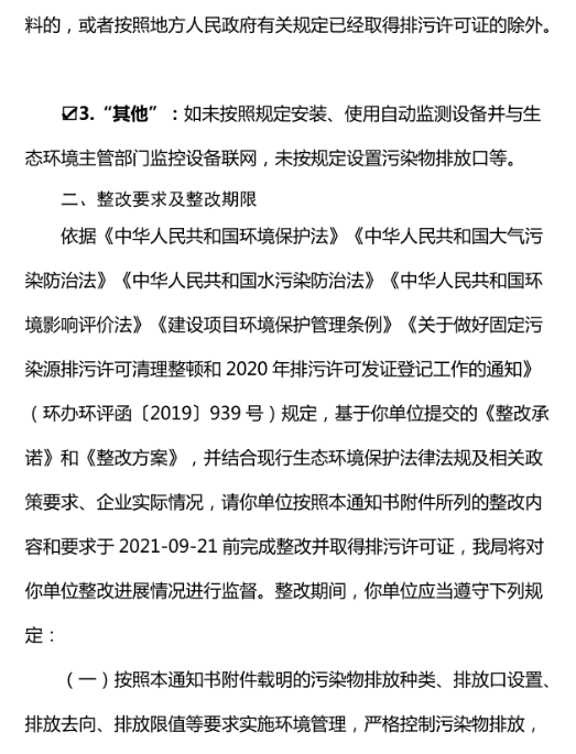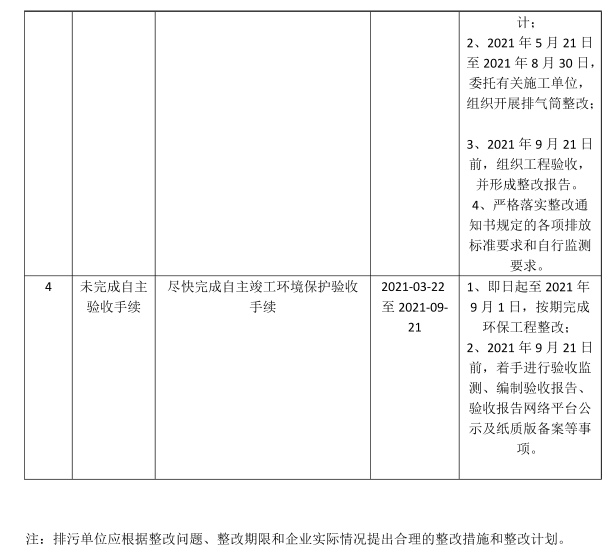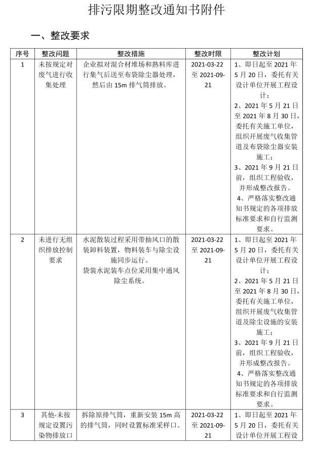 1、即日起至2021年9月1日,按期完成环保工程整改;