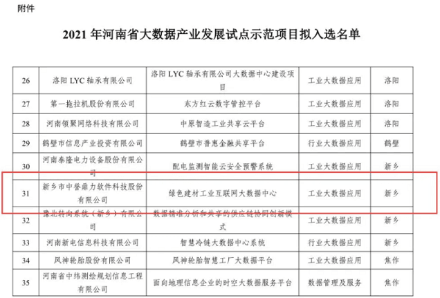 新乡市中誉鼎力软件科技股份有限公司(后简称“中誉鼎力软件公司”)以企业生产过程优化方向申报的工业大数据应用项目——绿色建材工业互联网大数据中心成功入选,并顺利通过公示,成为卫辉市首个省级大数据产业发展试点示范项目,也是新乡市4个入选项目中唯一的县市级企业项目。